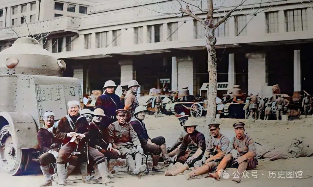 在日本海军陆战队本部大楼前,停着很多辆装甲车,一些海军陆战队士兵坐在装甲车前。日本海军特別陆战队司令部旧址,位于今四川北路2121号,始建于1935年。