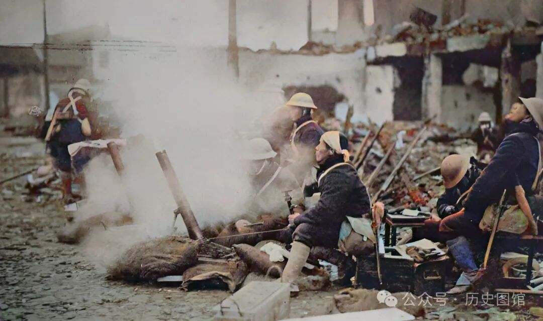 日军一支炮兵部队,正在闸北三义里,用迫击炮朝中国军队阵地发射炮弹。背景里的三义里街道上,墙倒屋塌,到处是断壁残垣。
