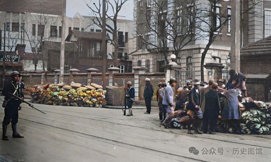 这张照片,拍摄于北部日本小学门口,有日军在站岗。十几个日本居留民在校门口构筑沙袋掩体。