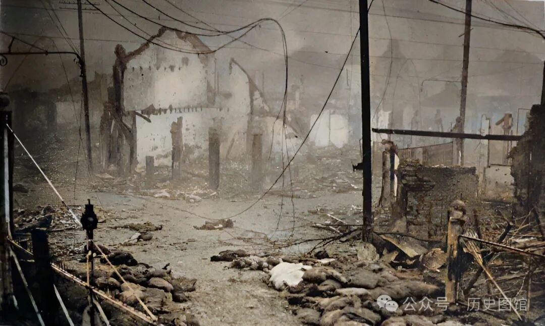 这是经历残酷战斗后的闸北,昔日繁华的街区,到处是断壁残垣,折断的电线垂在地上。地面上有不少阵亡士兵遗体,还没来得及收敛。
