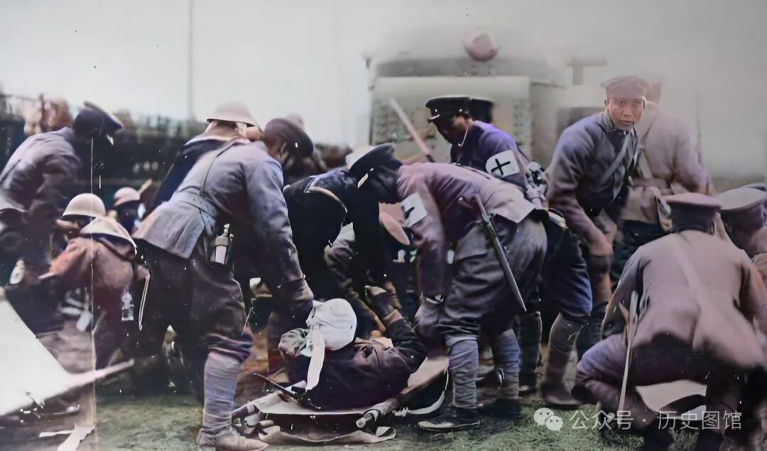日军海陆联合看护队的士兵,正将一些负伤的日本兵抬上火车,运送到战地医院。在这些医护兵的胳膊上,戴着红十字袖章。不远处,停着一辆装甲车。