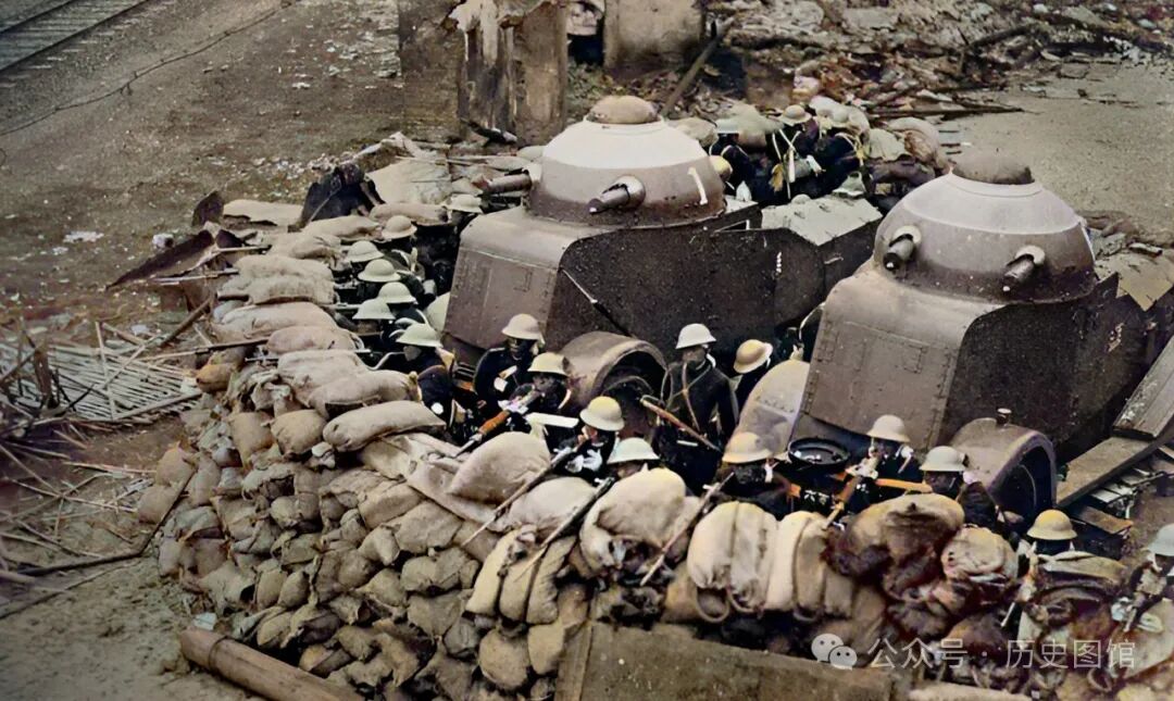 这张照片,拍摄于虬江路。日军陆战队在这里设置了沙袋掩体,日军士兵躲藏在后面。两辆装甲车,枪口朝向中国军队阵地方向。照片左上角,能看到有铁轨。