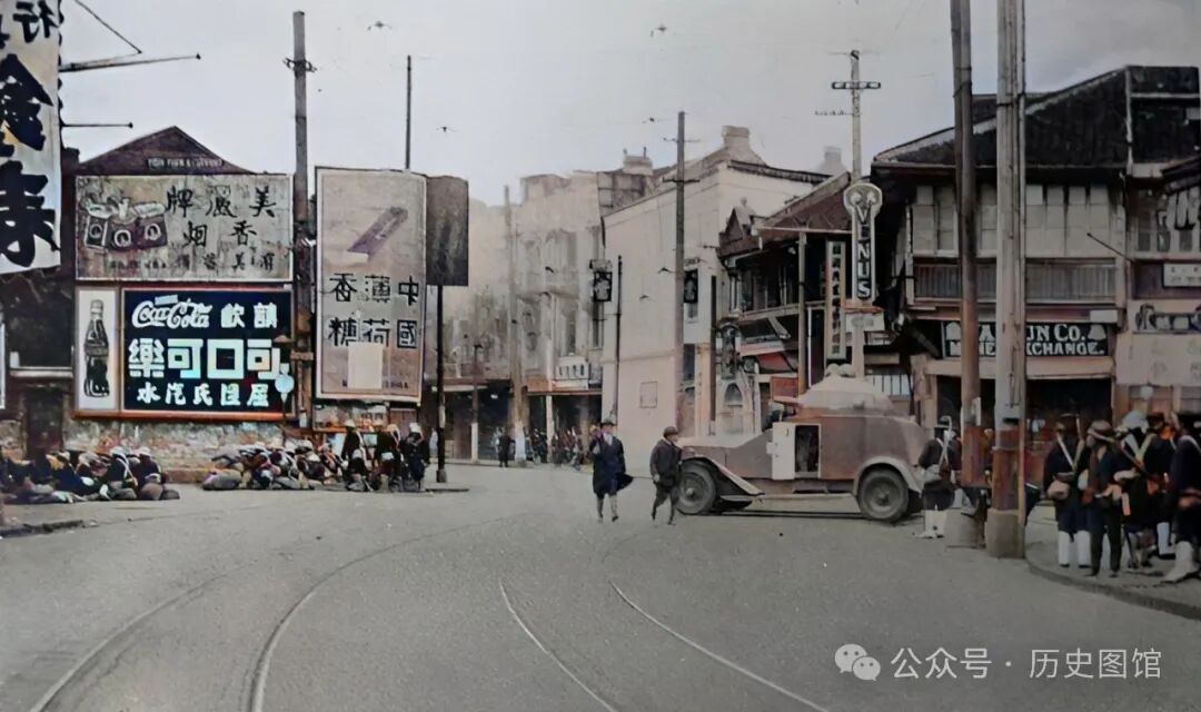 北四川路附近,日军的便衣队正在街头警戒,路口设有沙袋掩体,还停着一辆装甲车。大街上空荡荡的,看不到当地人的影子,店铺关门闭户,到处都是日军士兵。