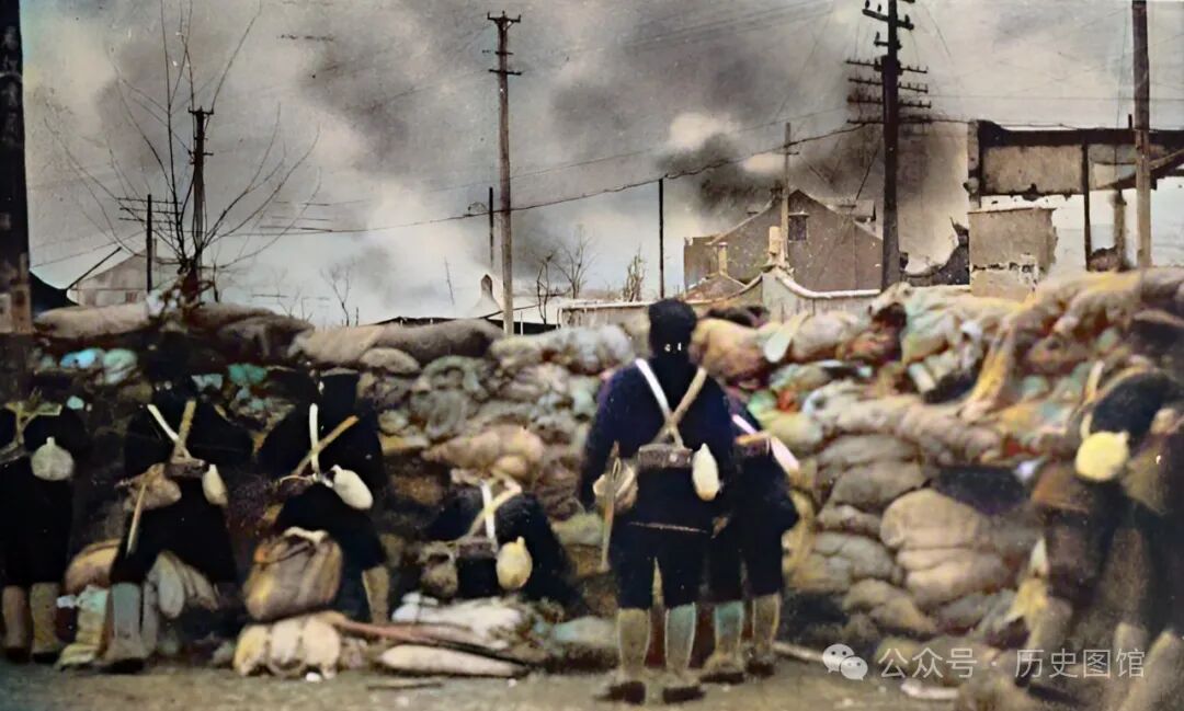 日军在横滨路铁道附近,设置了一人高的沙袋掩体。日军士兵躲在掩体后面,望着远处被轰炸过的城区。那里硝烟弥漫,房倒屋塌,不知有多少无辜生灵涂炭。