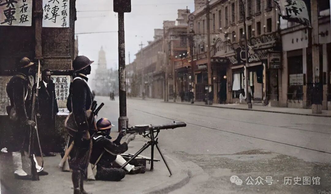 日军便衣队士兵,在北四川路口架起重机枪,严密监视着周围的一切动静。昔日繁华的北四川路上,所有的店铺都关着门,路面上见不到一个人影,寂静得让人害怕。