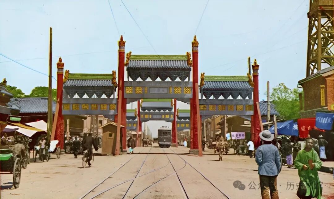 北京西四牌楼前景象。西四牌楼,与之对应的是东西牌楼。是北京两个重要的交通要道。1954年,为了改善道路狭窄现象,四座牌楼被拆除。