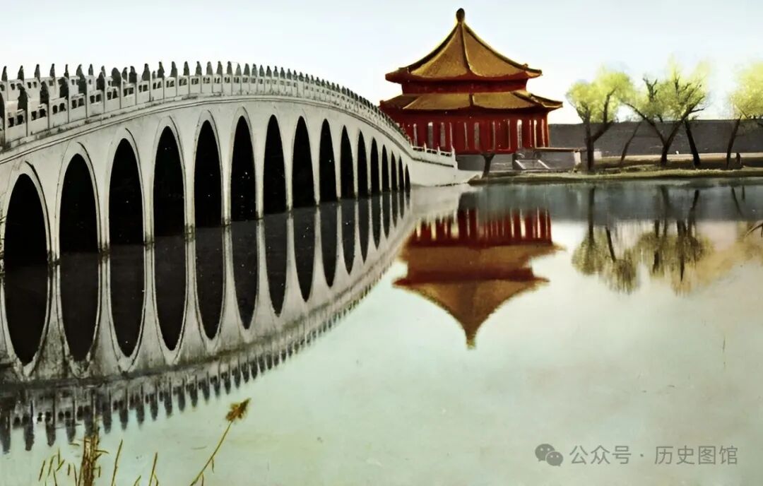 这是位于颐和园里的十七孔桥,它是中国园林中最大的一座桥梁。该桥东连廓如亭,西接南湖岛,长150米。颐和园十七孔桥,有十七个桥洞。十七孔桥造型优美,是颐和园里最著名的景点之一,出现在北京颐和园的很多画面上。