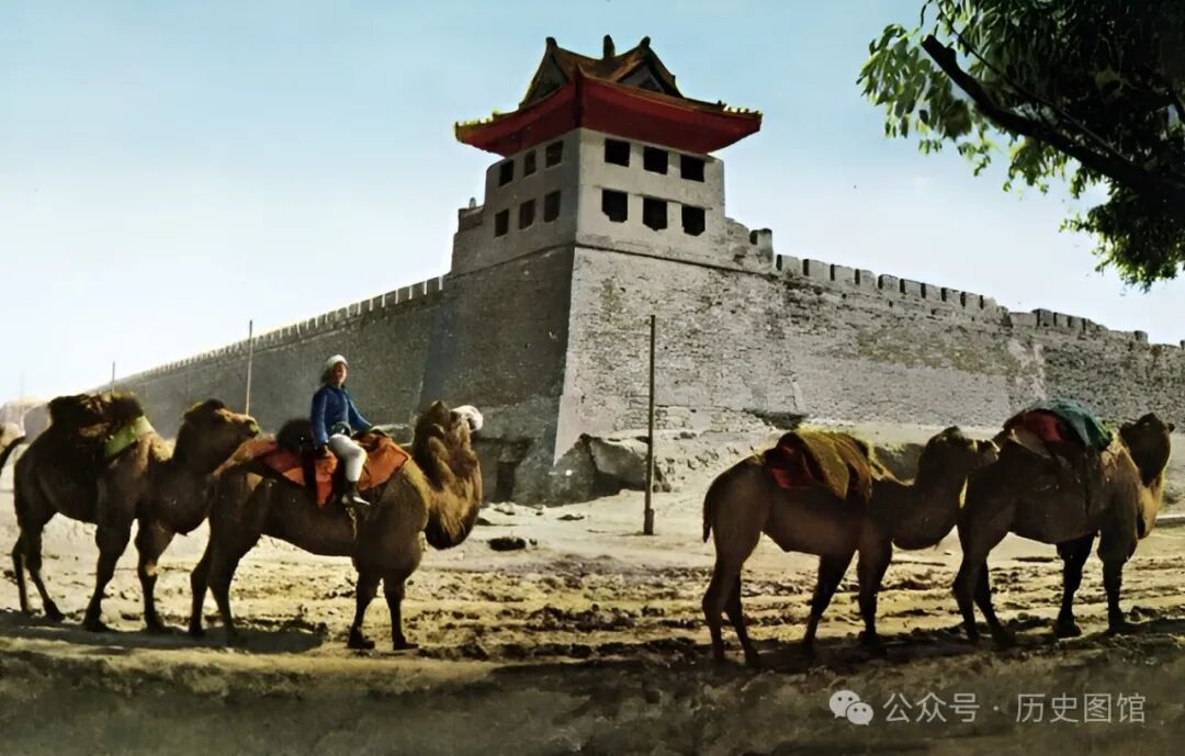 这是位于北京城墙外的景象,一支驼队,排着队伍从城墙附近走过,耳边似乎听到了悠扬的驼铃声。在过去,骆驼是北方地区最主要的交通和运输工具。