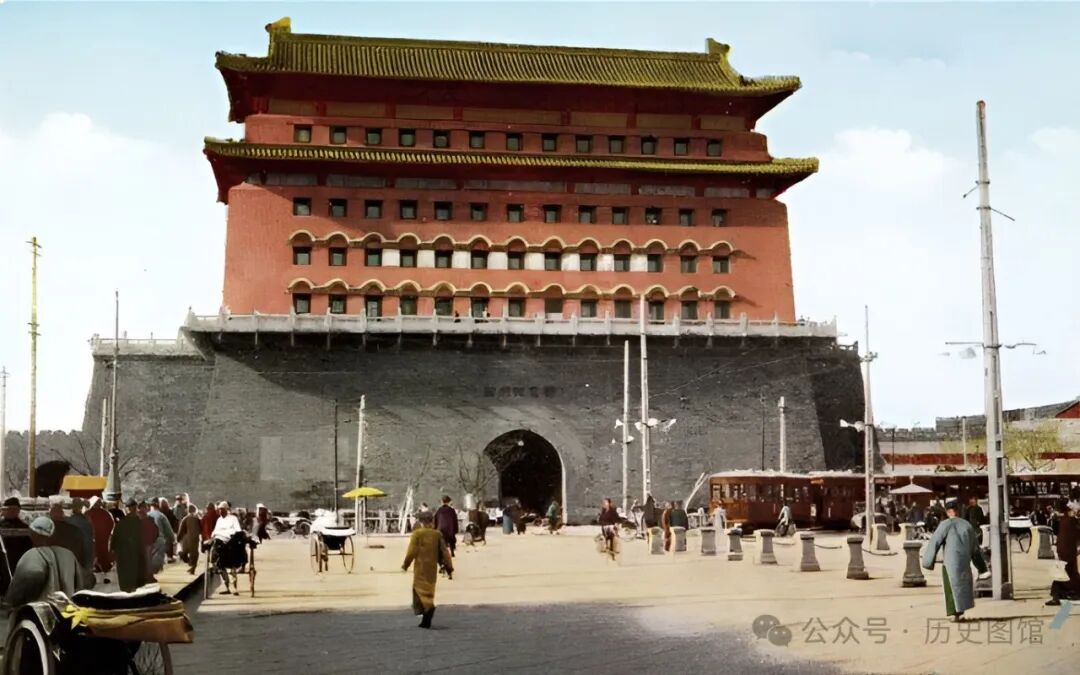 照片中这座城楼,是北京的正阳门箭楼,建造于明正统四年(1439年),八国联军攻占北京时被焚毁。1901年重建,是北京最高大的箭楼。箭楼前停着一列火车。