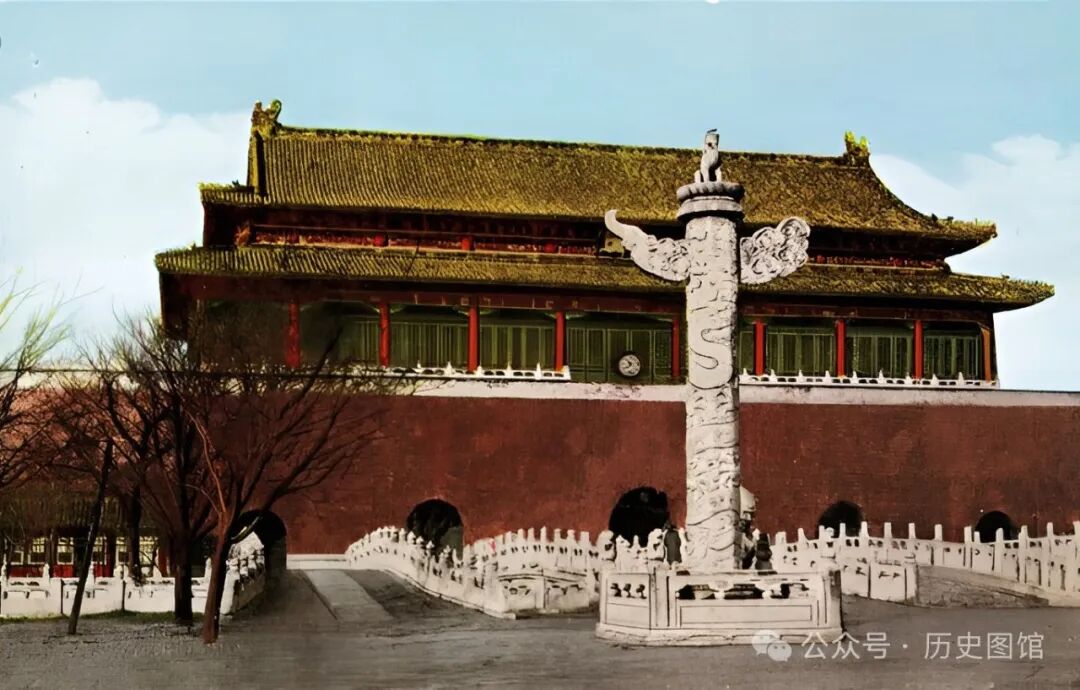 照片里的天安门,为重檐歇山顶建筑,看上去雄伟庄严。天安门城楼前有金水河、金水桥和华表。如今的天安门广场,是世界上最大的城市广场。