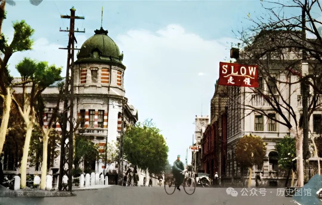 这里就是当时的北京东交民巷,大街两侧多为欧式建筑。街边的牌子上写着“慢走”字样。东郊民巷,西起天安门广场东路,东至崇文门内大街。在近代,这里曾经是著名的外国使馆区,也被称为使馆街。