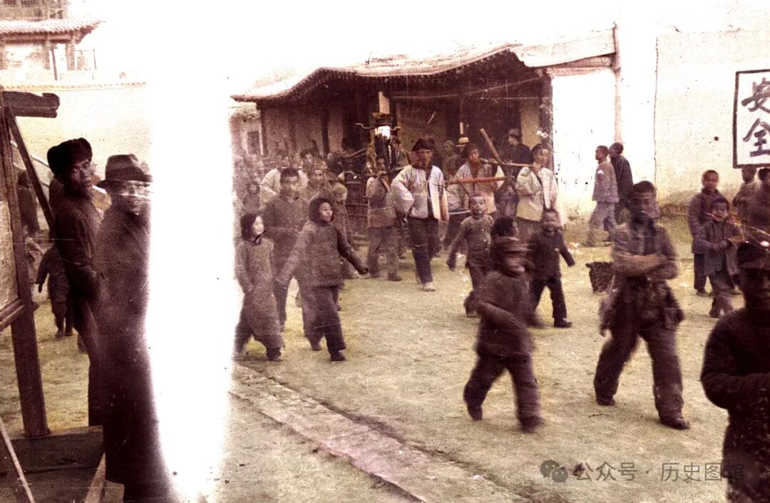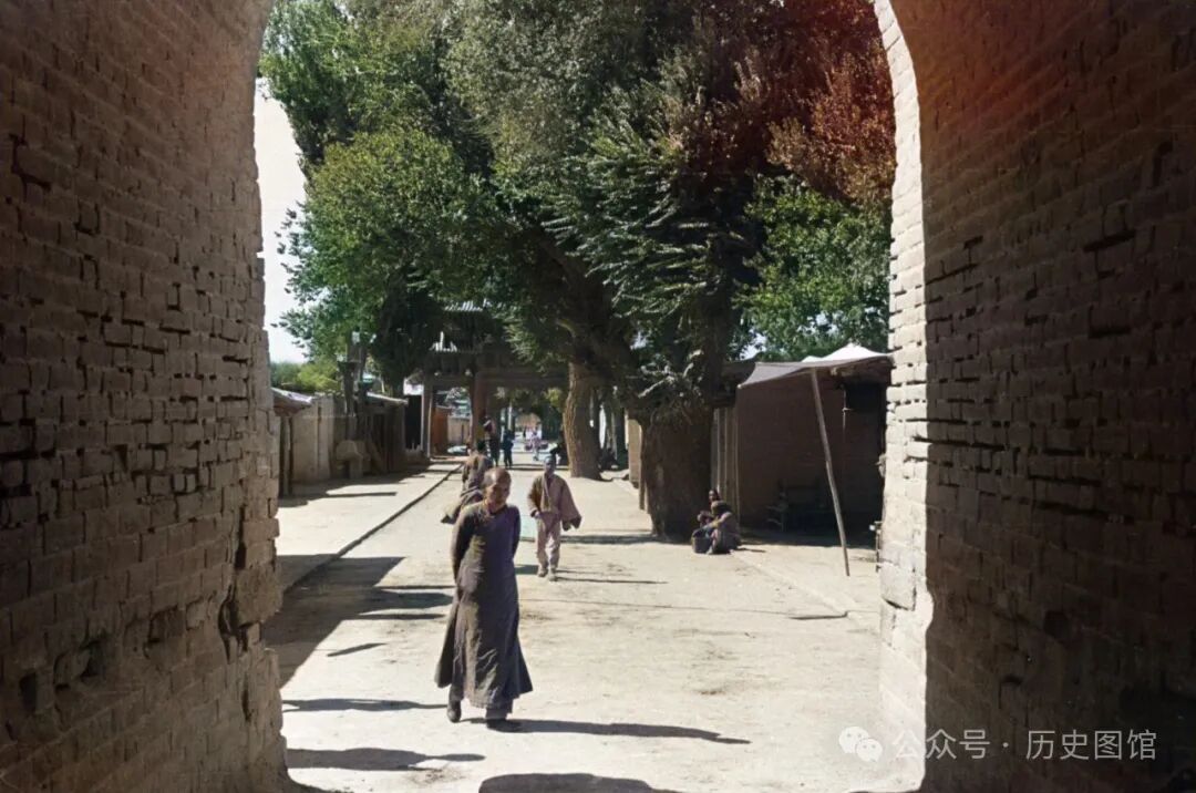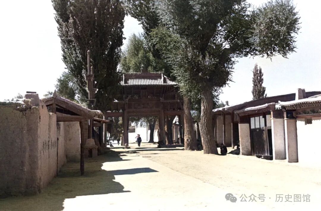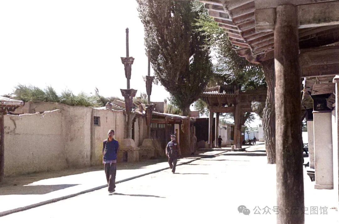 穿过敦煌县城的城门,就进入了城内。大街上有座牌坊,路旁建筑的门口,矗立着两根旗杆,那里应该是一座寺庙。一名警察从大街上走过,画面很有年代感。
