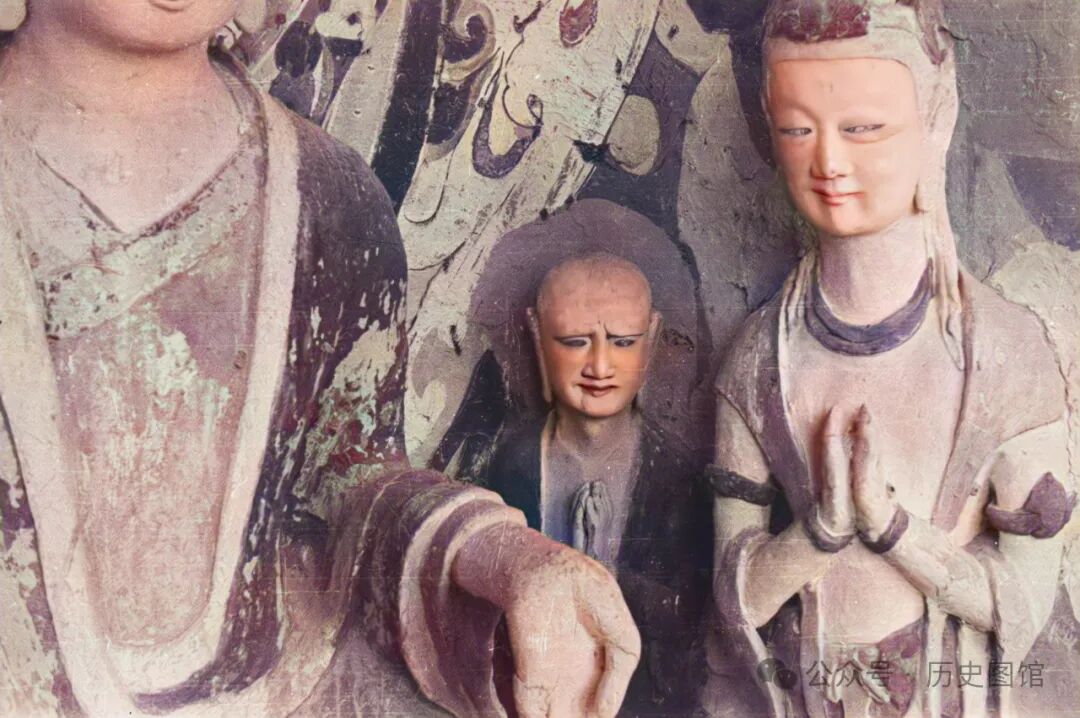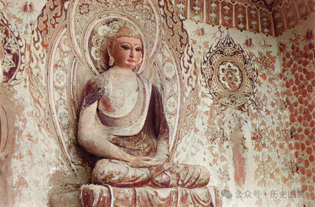 1943年,甘肃敦煌千佛洞415窟,在西面石壁佛龛内,有一尊菩萨坐像,建造于宋代。这尊菩萨面容慈祥,双眼低垂,看上去很美。背景墙壁上描绘的笔画也十分精美。