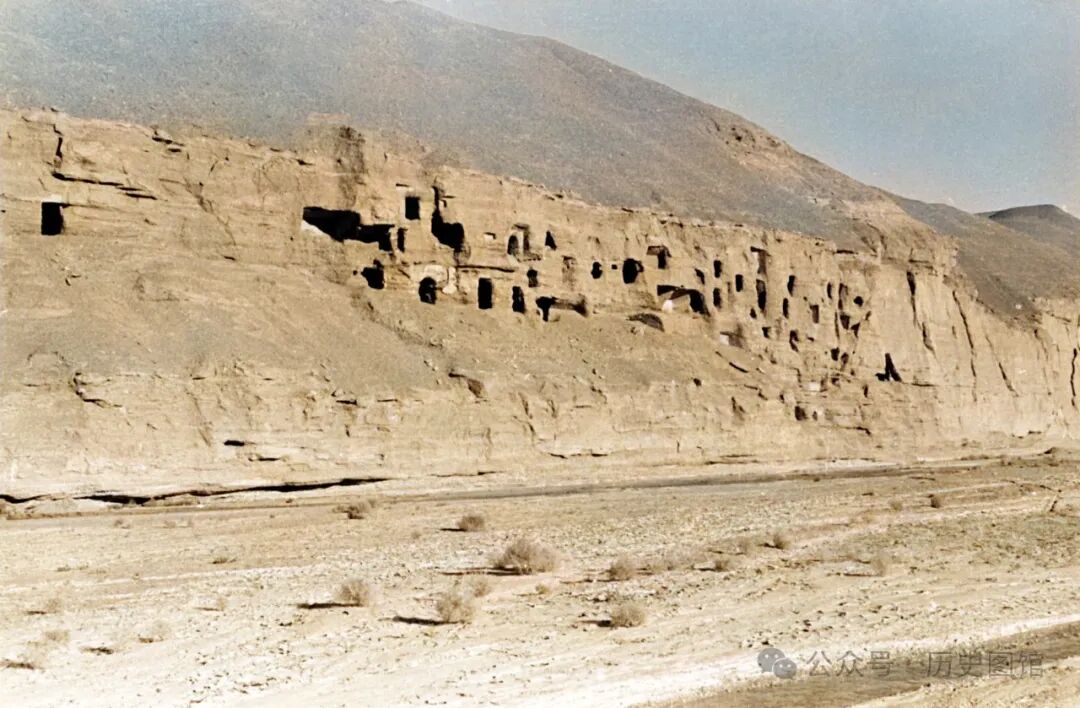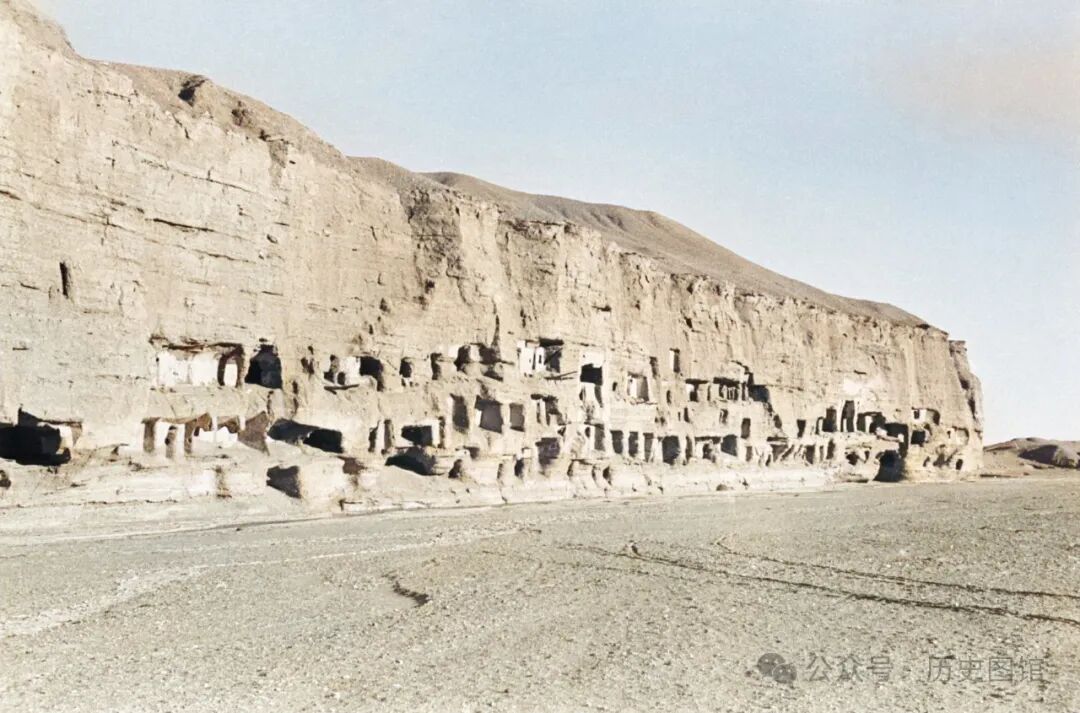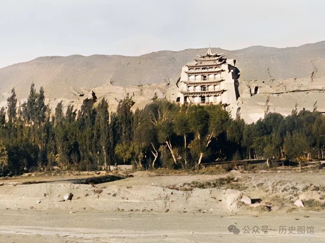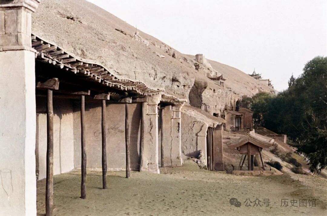 李约瑟站在敦煌千佛洞138号洞前,洞壁椽用木柱支撑。从这里向北面望去,北洞窟区崖壁上,分布着很多石窟和建筑,一眼望不到尽头。