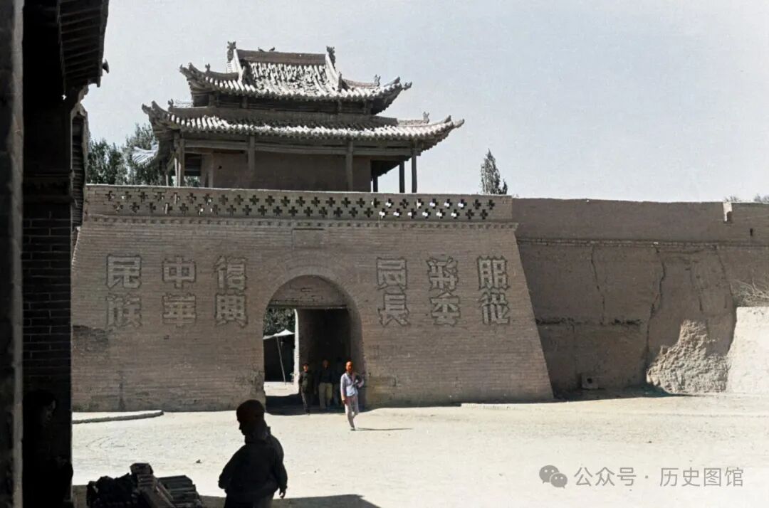 1943年,甘肃敦煌县城门前景象。城台为方形,城墙突出墩台开为城门,上有歇山屋顶楼阁。