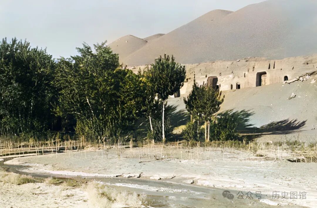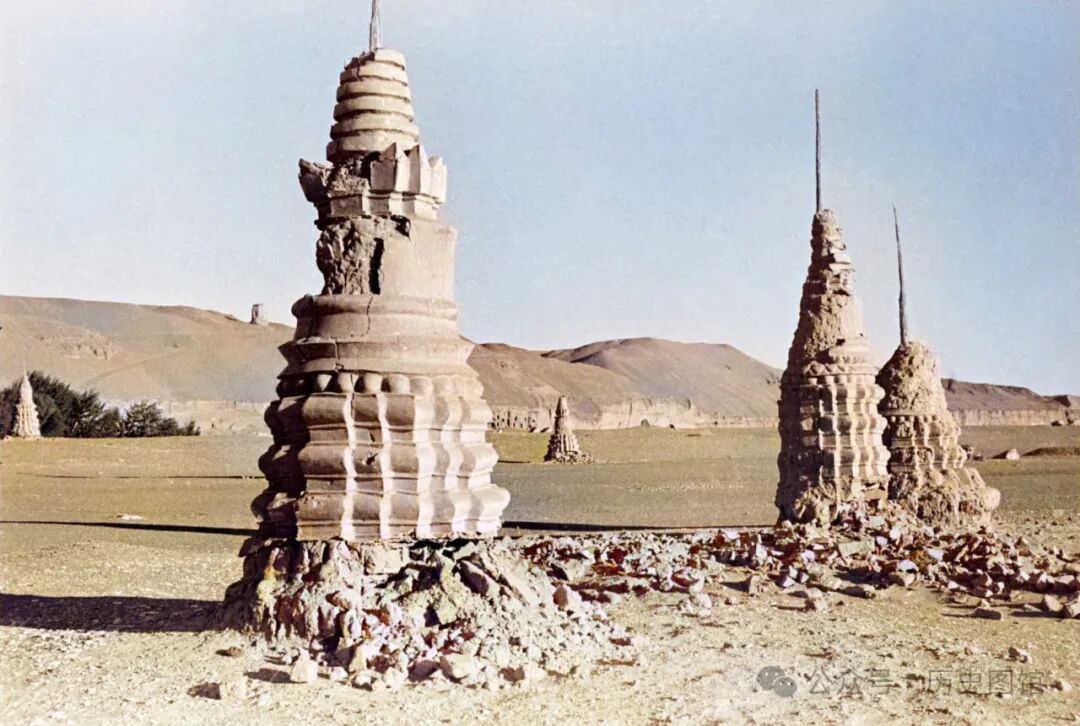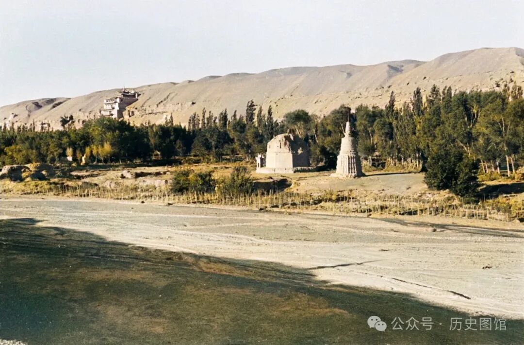 李约瑟站在大泉河东岸远眺,对岸有大片的绿洲,树木郁郁葱葱。两座造型各异的白色古塔,分别是舍利塔、千相塔。