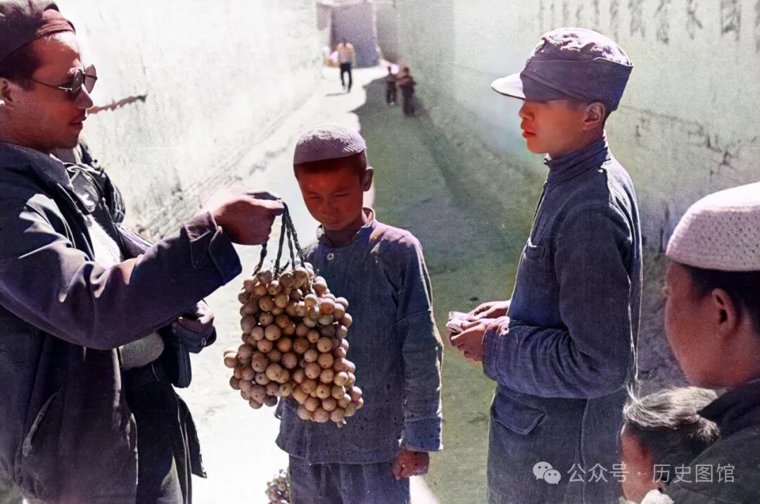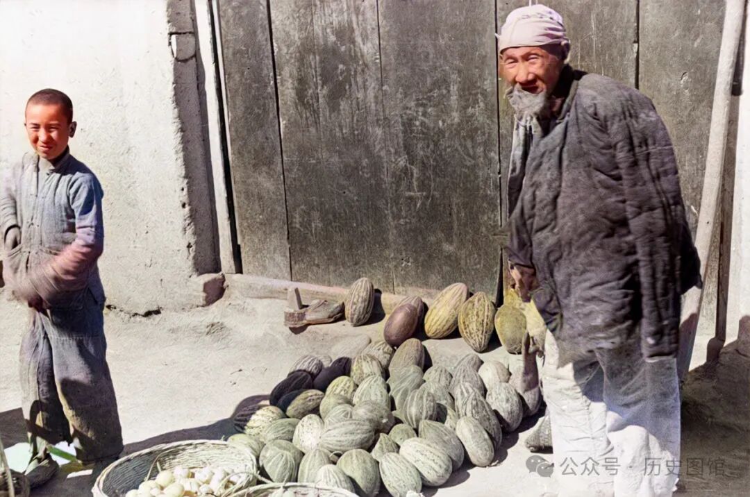 1943年,甘肃敦煌街头,一位胡子花白的老翁,正带着孙子在卖哈密瓜。他家的哈密瓜又大又甜。李约瑟拍下了这张富有生活气息的照片。