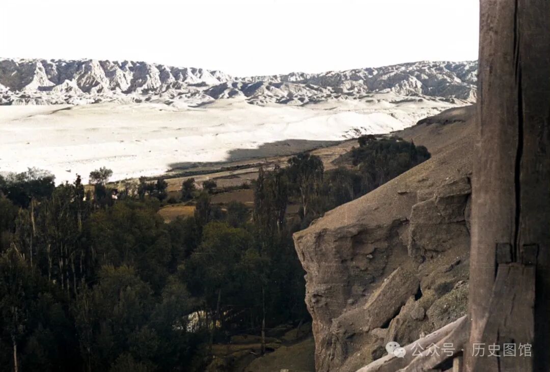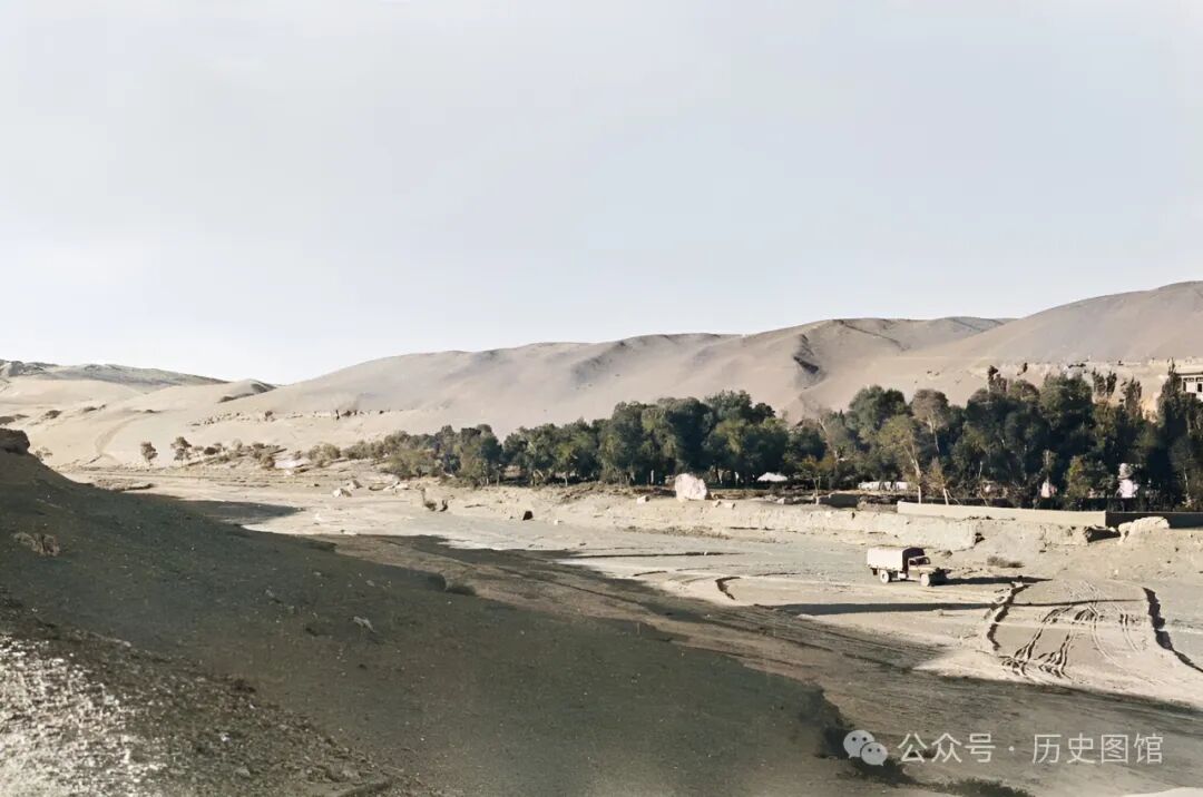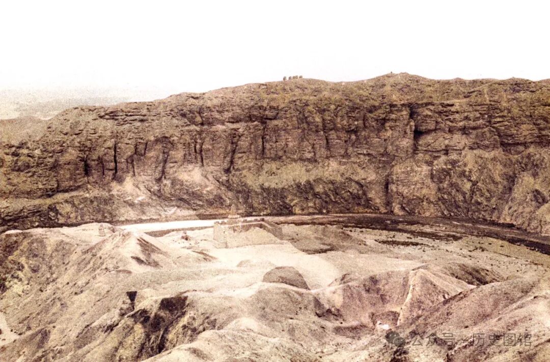 1943年,甘肃敦煌三危山成城湾景象。大泉河河谷岸边,有一座小型炮台,建造于汉代。