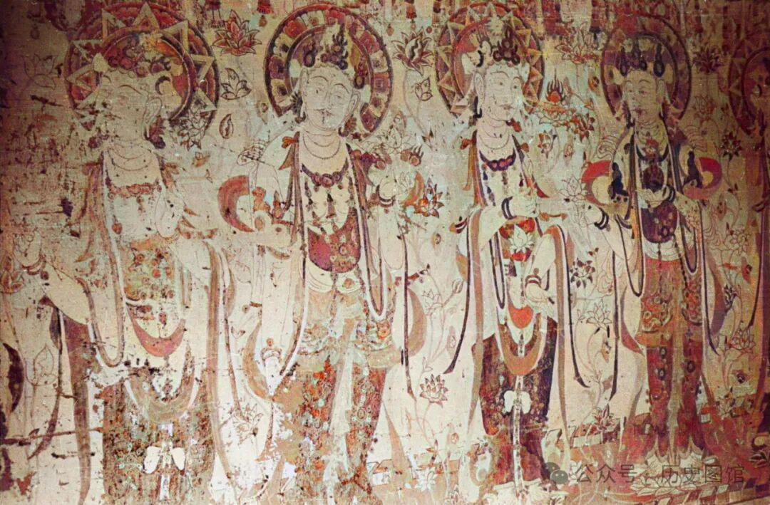 敦煌千佛洞第130窟的中层,在甬道南面的墙壁上,描绘着四位菩萨画像。