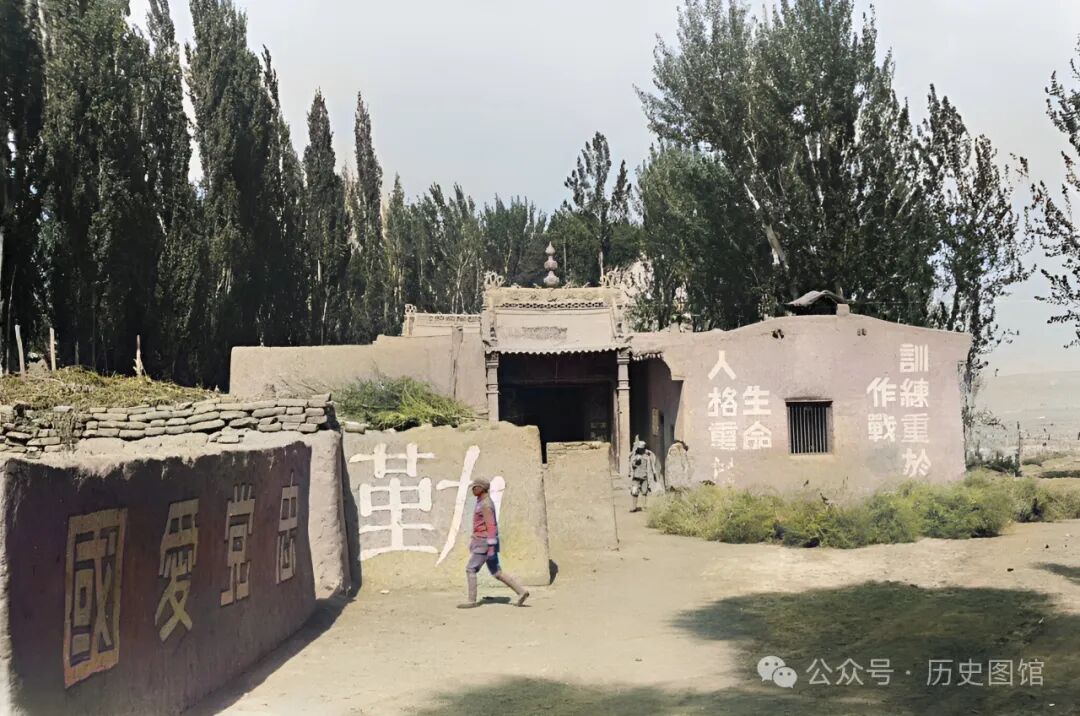 1943年,甘肃敦煌千佛洞附近的一座寺庙,名为“三清宫”,俗称“下寺”。墙壁上刷着一些标语,一名士兵从寺院门口经过。