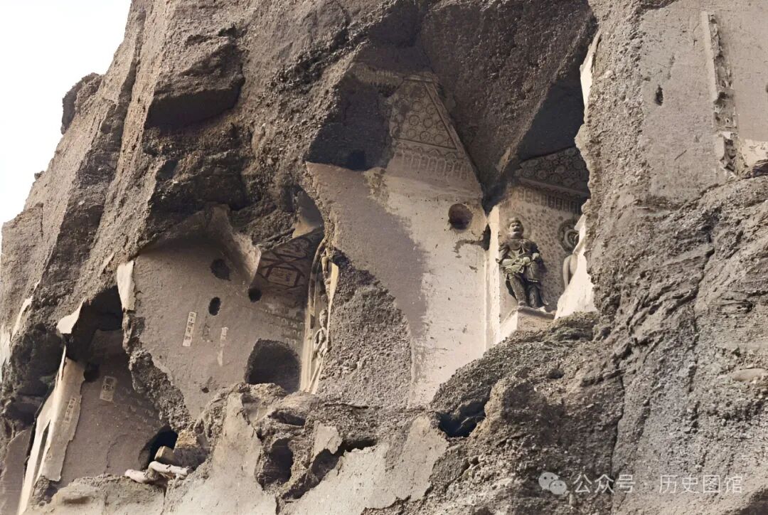 这张照片里的洞窟,是莫高窟的第417、416、415洞窟。从外观上看,已经遭到了严重的损坏,大部分岩壁已经坍塌,露出了洞窟的内部。石壁上的一些人物造像,也裸露在外面,风化很严重。