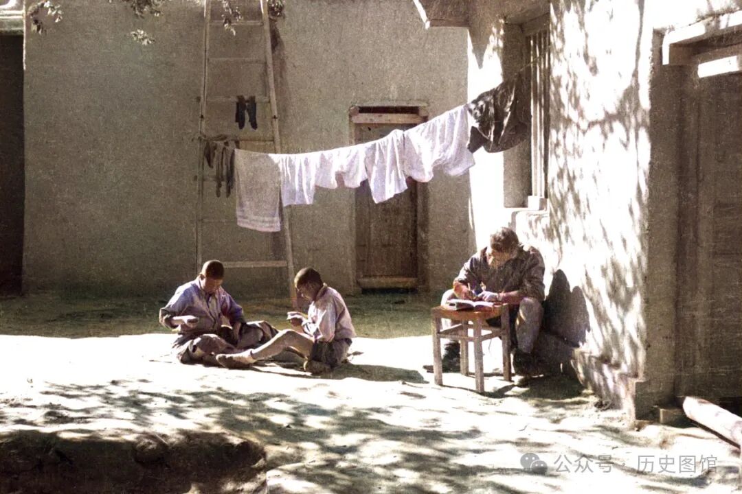 莫高窟中寺前院,也就是敦煌艺术研究所办公地。李约瑟坐在房前墙根处,正在凳子上写着什么。随行的两个兰州培黎学校的学生,坐在地上缝补衣服。