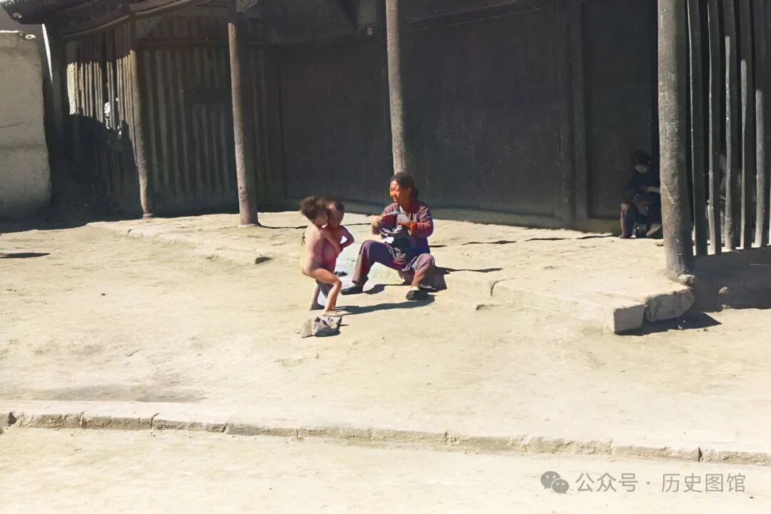 在甘肃敦煌的一座寺庙前,一名妇女坐在台阶上,她的两个孩子正抱在一起嬉闹玩耍。在寺庙屋檐下,还有几个女子带着孩子。李约瑟拍下了这张富有生活气息的照片。