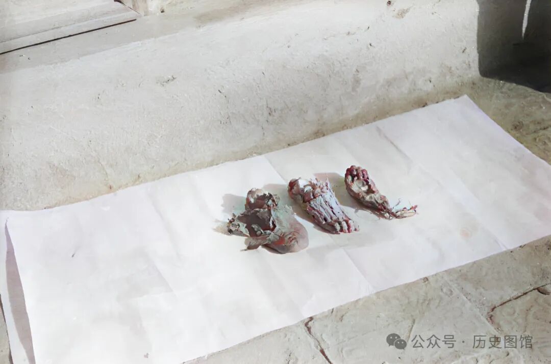 这是从敦煌千佛洞出土的一些珍贵文物,放在一张纸上。由于敦煌干燥的气候,使得它们被很好第保存了下来,成为了木乃伊。这三件文物,其中一件是腐烂了的皮鞋,有一只无名将军的手掌,还还有一个是公主的脚。