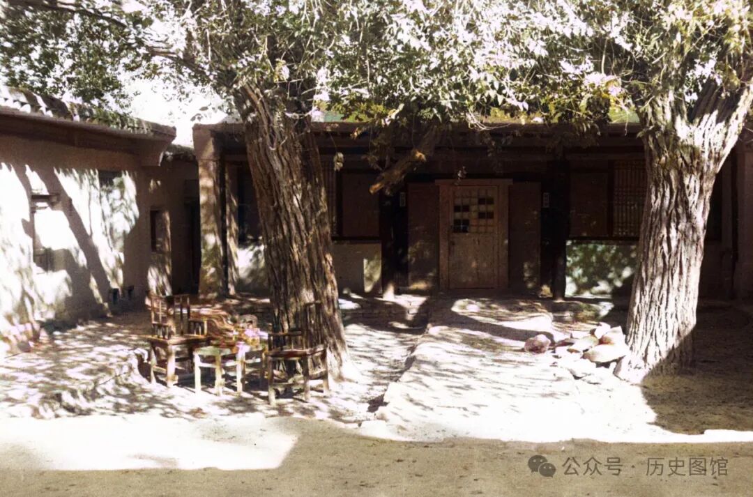 这是位于莫高窟中寺前院的一座房子,为当时敦煌艺术研究所的办公地,也是李约瑟和他的同伴们寄宿的地方。房屋面阔三间,门前有两棵大树,树下放着休息的桌椅。