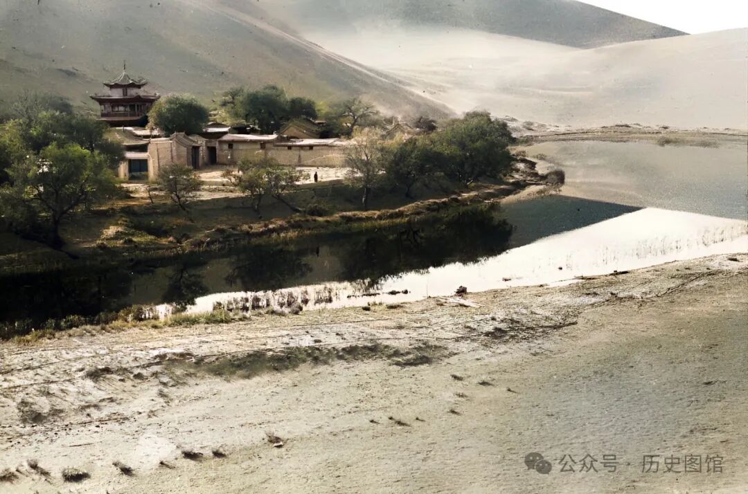 1943年,甘肃敦煌附近月牙泉景观。月牙泉处于鸣沙山环抱之中,外形酷似一弯月牙而得名。泉边的绿洲上,建有寺庙。自古以来就以"山泉共处,沙水共生"而著称,被誉为"塞外风光之一绝"。那时候的月牙泉,和现在不一样!