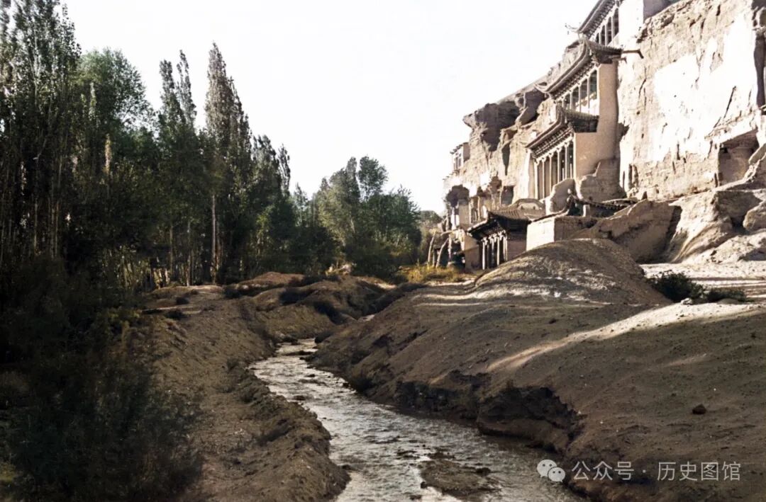 不远处,崖壁上的九层楼和洞窟清晰可见。由于常年水流不断,沟渠旁的树木得到滋养,长得很茂盛。