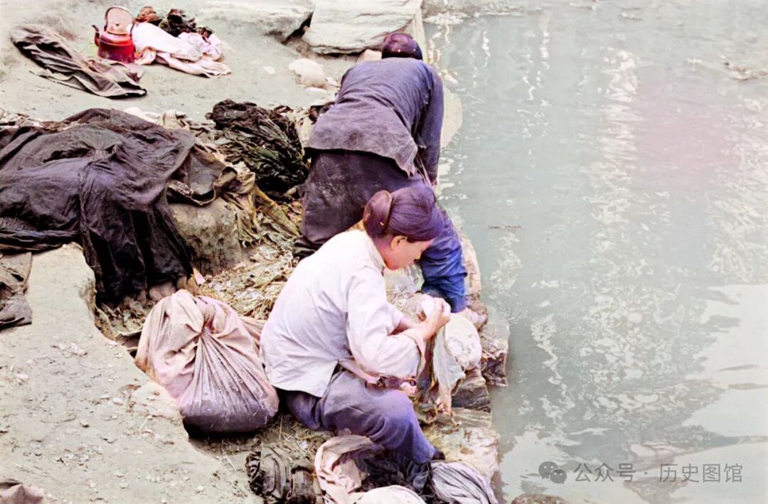 30年代,兰州当地几名女子,背着几个包裹,来到黄河边洗衣服。自古以来,兰州人的生活就离不开黄河。那时候的黄河水,看上还是比较清澈的,没有现在这么黄。