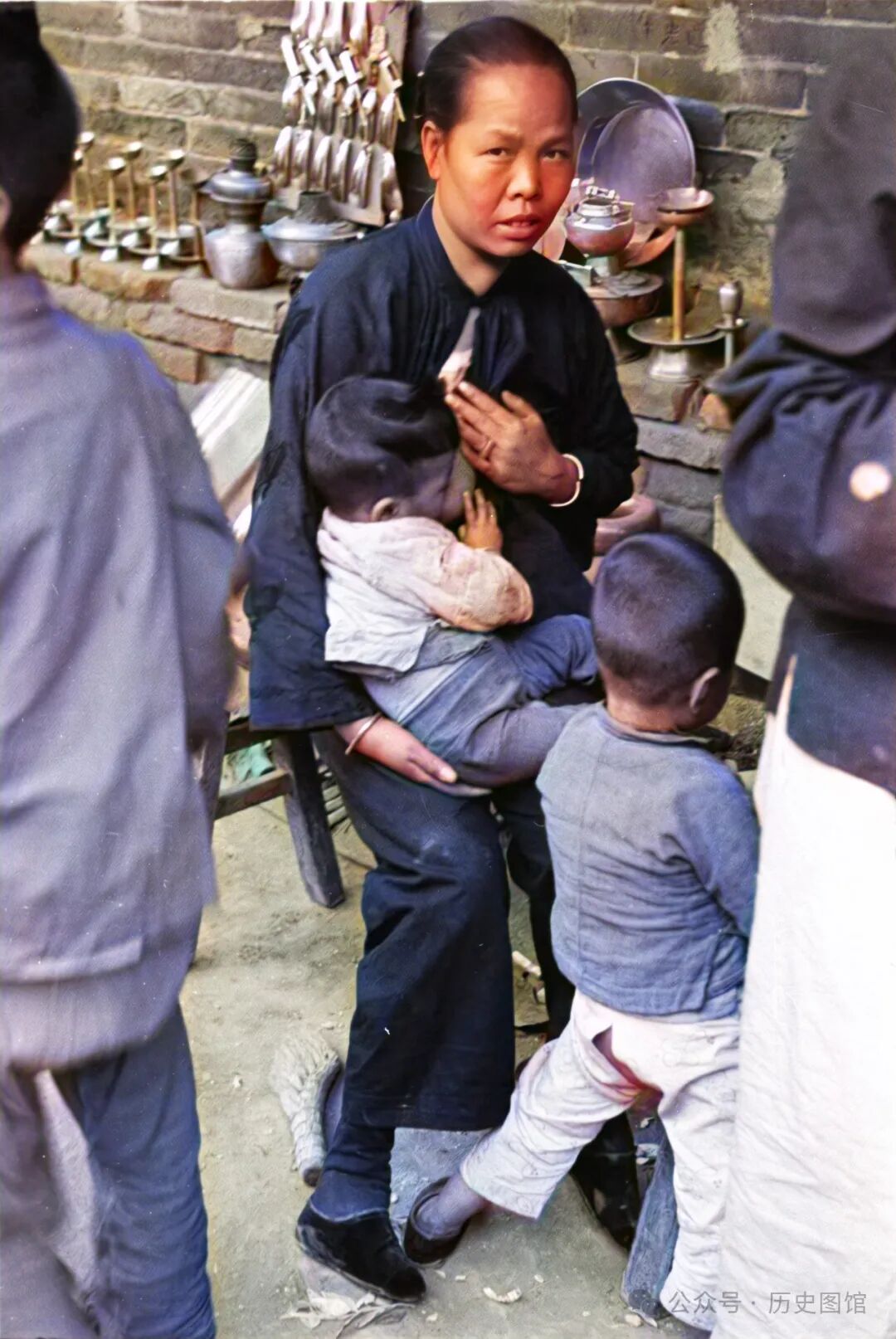 在兰州街头一家五金店门口,一名女子坐在板凳上。她一边抱着怀里的孩子,一边照看生意。