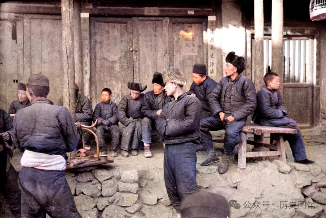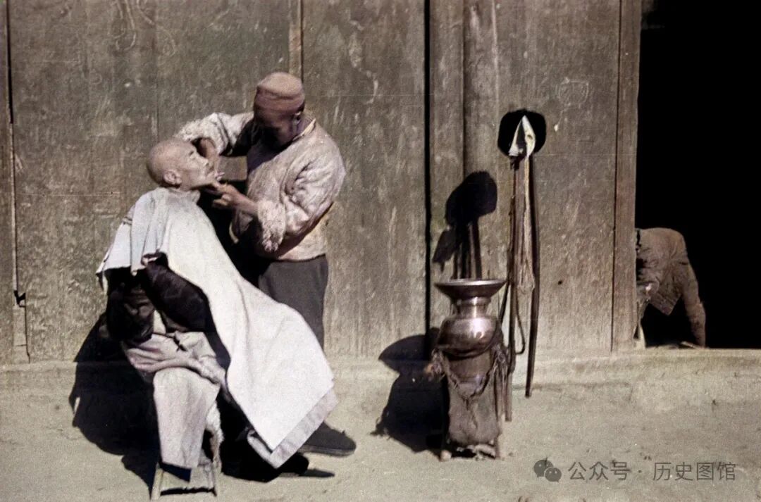 30年代,在兰州街头,一名流动理发师正在为顾客理发、修面。这是一种传统职业,他们挑着担子,走街串巷。担子一头装着理发工具箱,另一头是火炉脸盆。只要有人需要理发,他们可以随时停下来,拉开场子就地为顾客理发。