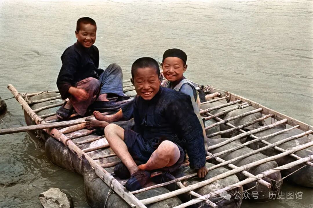 黄河边上,三个孩童坐正在一个羊皮筏子上。他们自幼生活在黄河边上,从小便与羊皮筏子打交道。别看他们年纪不大,但已是非常出色的水手了。