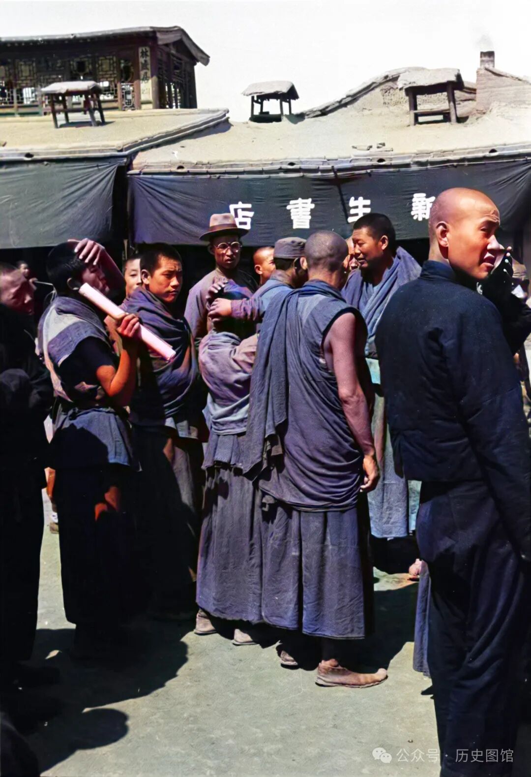30年代,在兰州城内的新生书店门口,聚集着一群喇嘛。在他们中间,站着一名军人模样的人,好像正在检查什么。