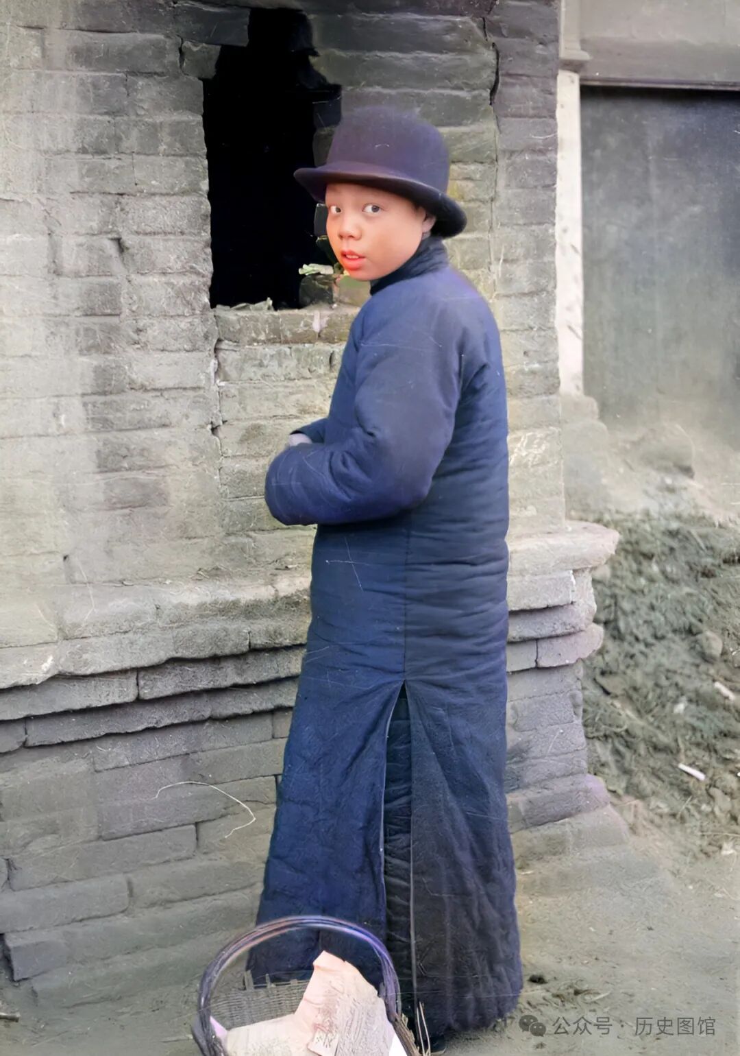 在一座寺庙里,一名小男孩,看上去年纪不大。他身穿棉袍头戴礼帽,站在一座砖塔前焚烧香火。地上的竹篮里,装着一些香火纸钱。看到有外国摄影师拍照,他转过头好奇地看着镜头。