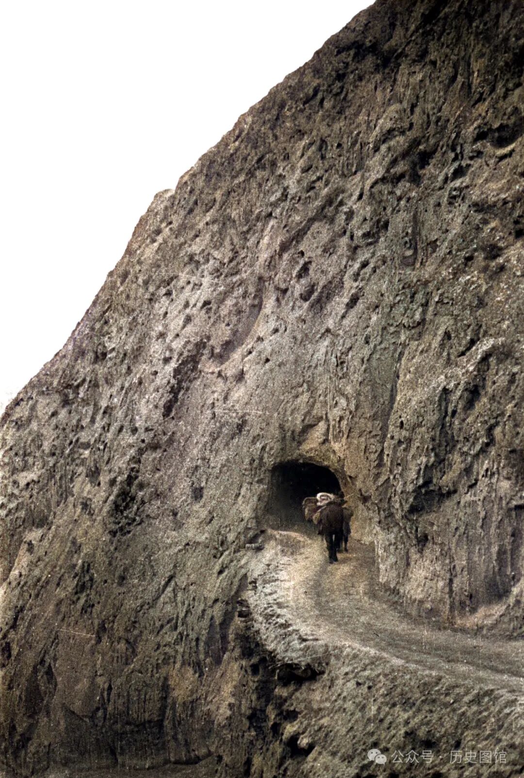 兰州城外一条狭窄的山路,一面是陡峭的山体,一面是万丈深渊。小路的尽头,是一个人工开凿的隧道。如果没有这个隧道,这里的人们要翻越好几座大山。照片中,一名男子牵着马匹正在进入这个隧道。山上光秃秃的,没有什么植被。
