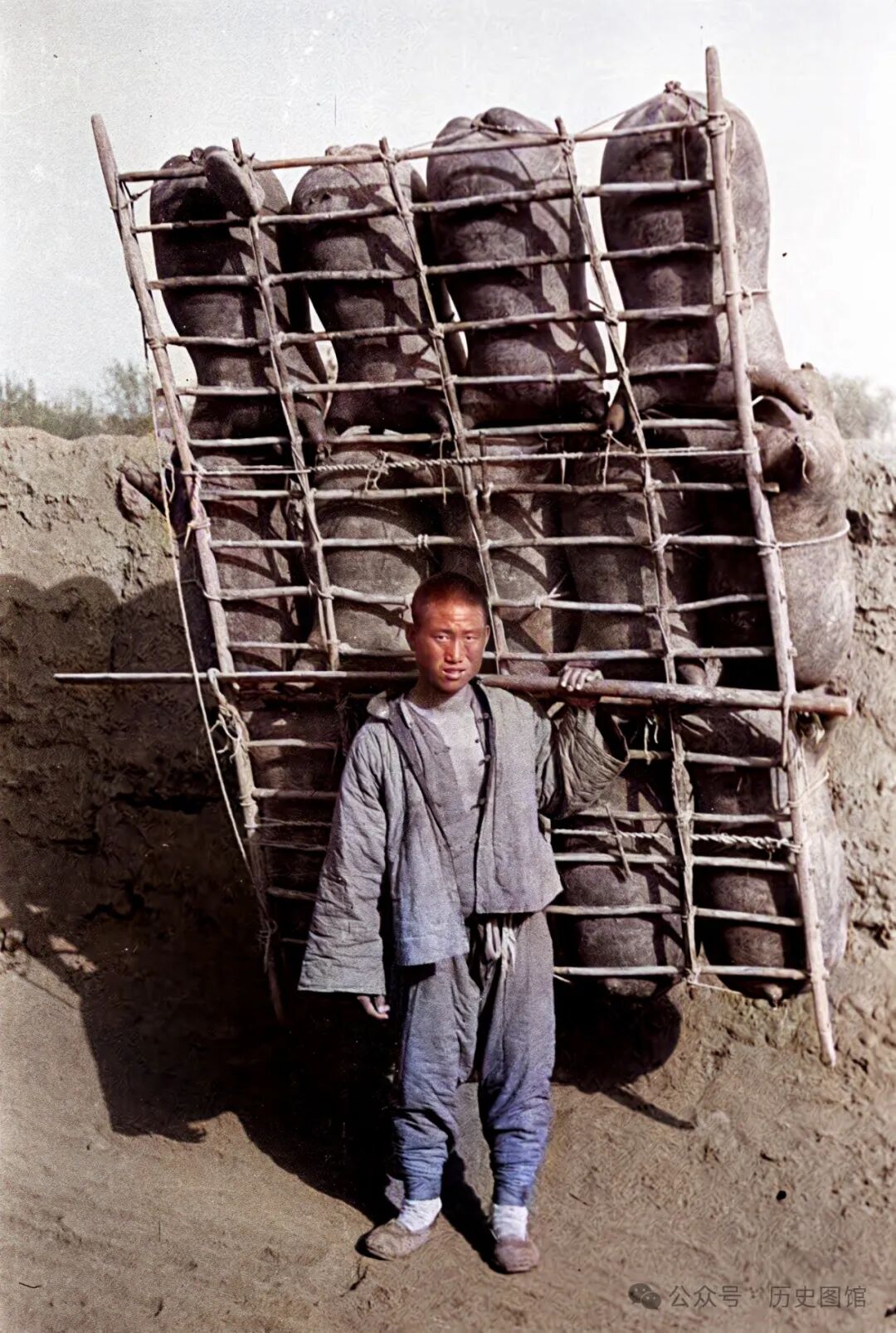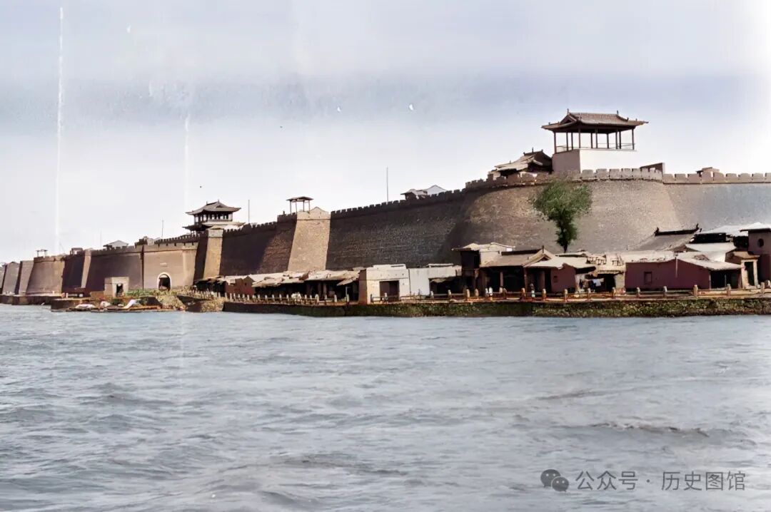 照片中,瓮城外是一个小码头,停着一些木筏和羊皮筏子。有几名当地人走下河堤挑水。还有的人站在水里清洗马匹。