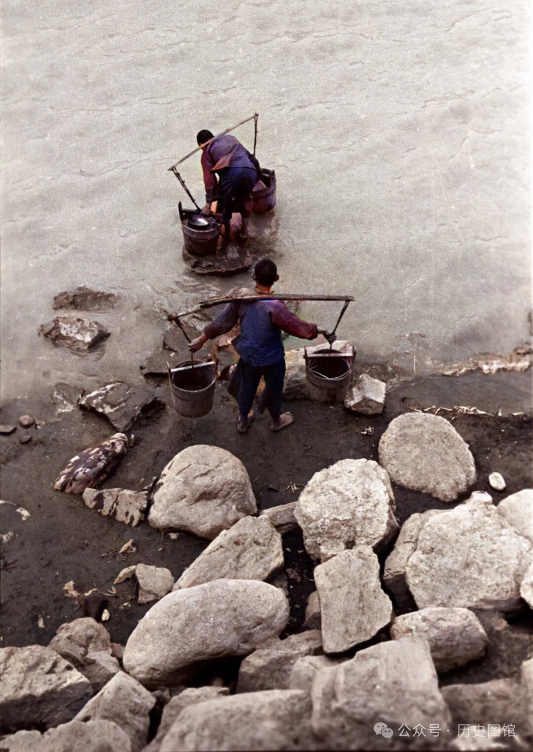 30年代,一些兰州当地人,挑着水桶下到黄河边上取水。千百年来,黄河静静地滋润着兰州儿女的心田。兰州人的生活离不开黄河。
