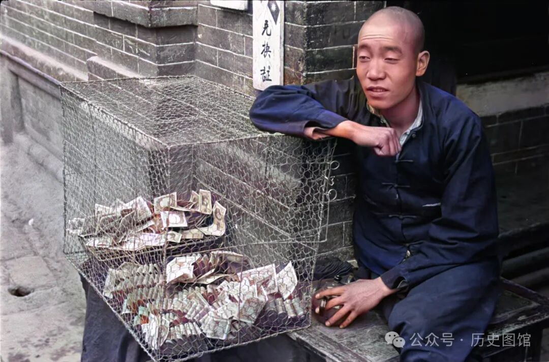 30年代,甘肃兰州街头,一名光头男子坐在街角,守着一个铁丝网做的带开门的方形笼子,里装着不少纸币和硬币。男子一只胳膊搭在笼子上,左手拿着一个茶壶。墙角挂着一个小牌子,上面写着“兑换证”,你知道这是干什么的吗?