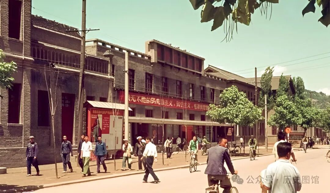 商店门口,具有时代特色的红色条幅十分醒目。街上有很多人在逛街,骑自行车的也不少。看到这样的画面,让人瞬间穿越到了那个如火如荼的七十年代。