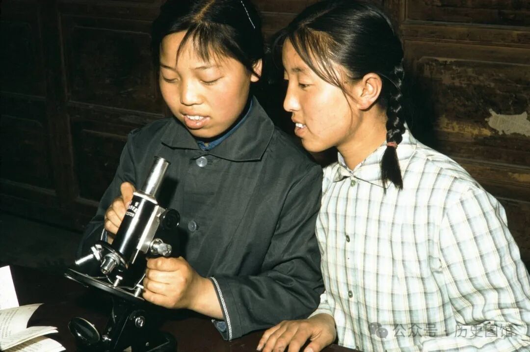 1973年,延安两名女青年,正在学校的实验室里操作显微镜,分析检验矿物质的成分。她们穿着朴素的衣服,梳着两只小辫。工作起来一丝不苟,充满了热情。