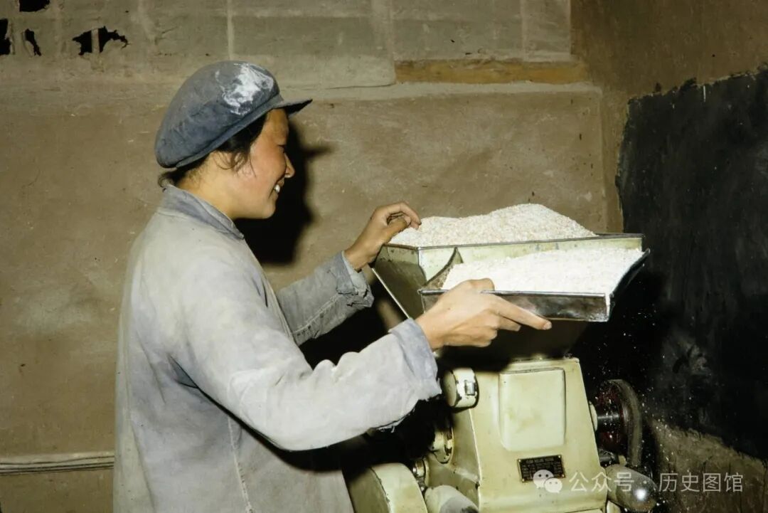 1973年,在延安当地公社的粮食加工厂里,一名女工正在机器前忙碌着。她穿着褪了色的工作装,戴着工作帽。从她脸上的笑容就可以看出,对自己的工作很满意,充满了热情。