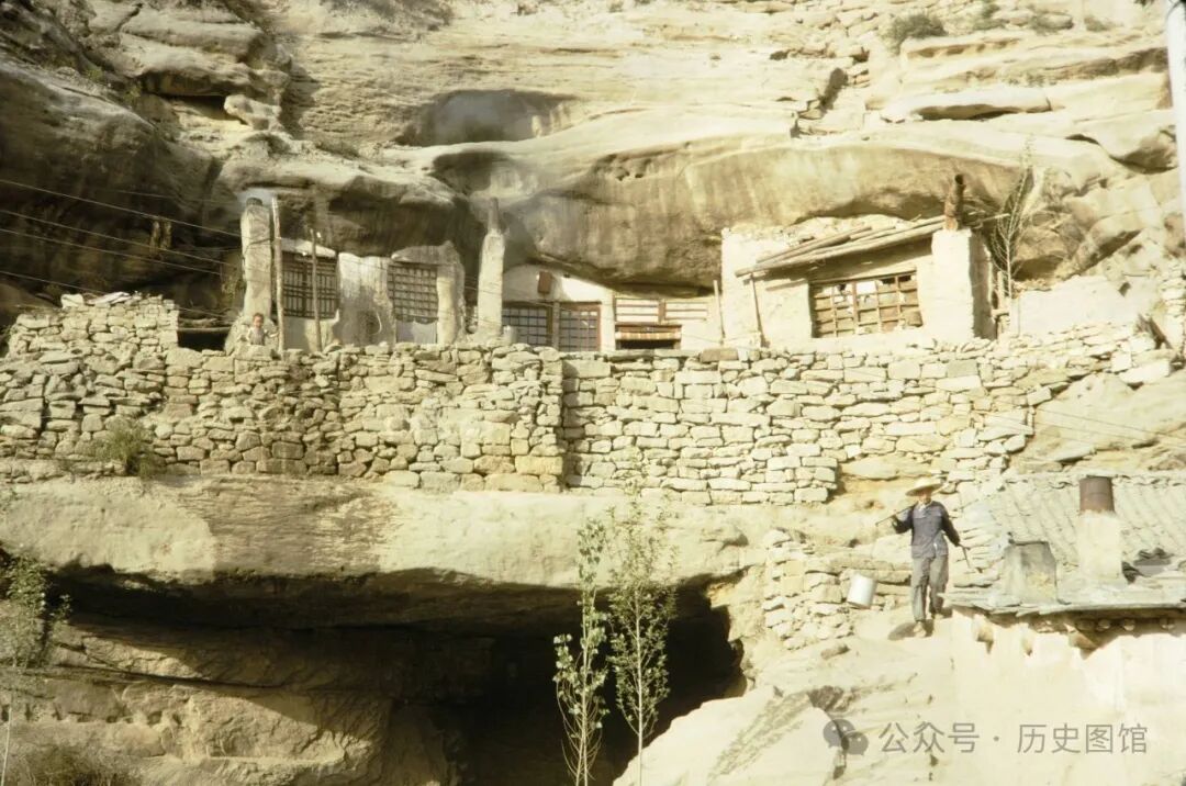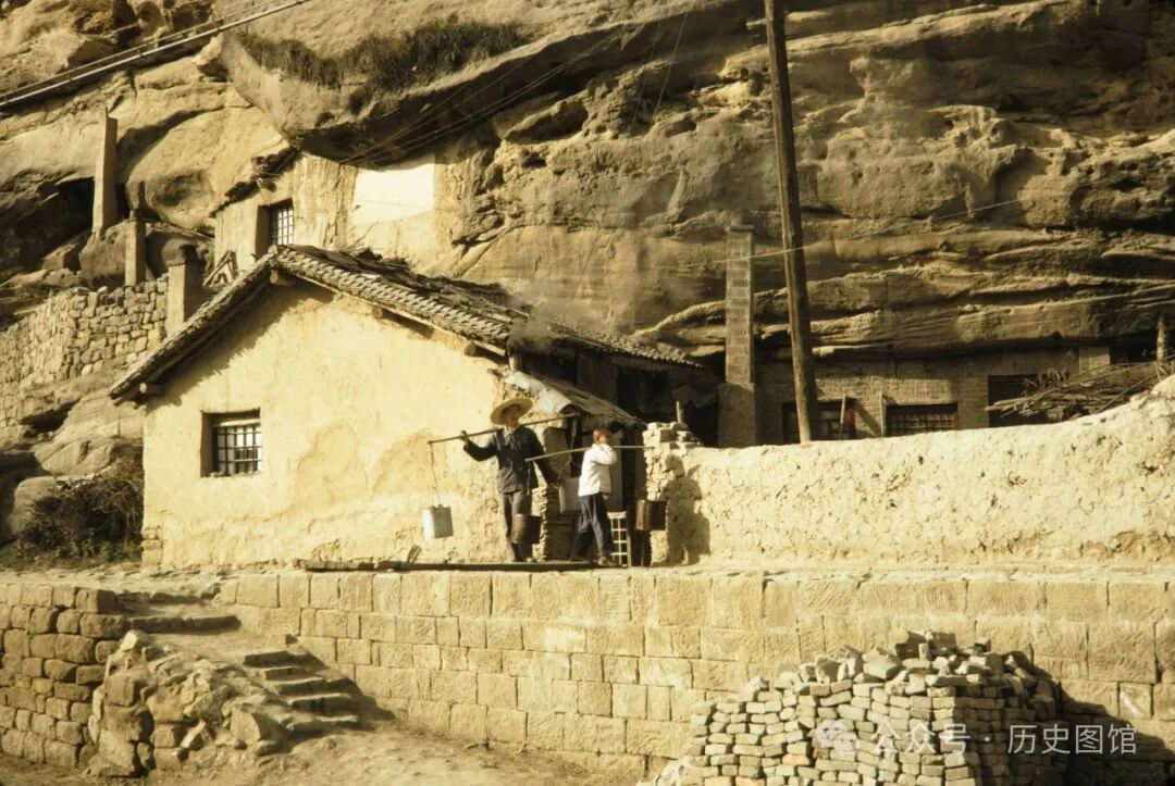 一名男子挑着水桶,从台阶上走下来,去河里挑水。他居住的是石窑洞,建在高处。窑洞外面用石头垒砌有围墙,一个孩子在院子里玩耍。