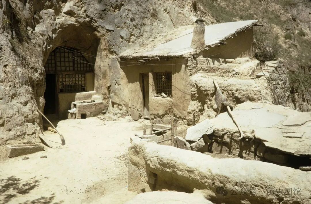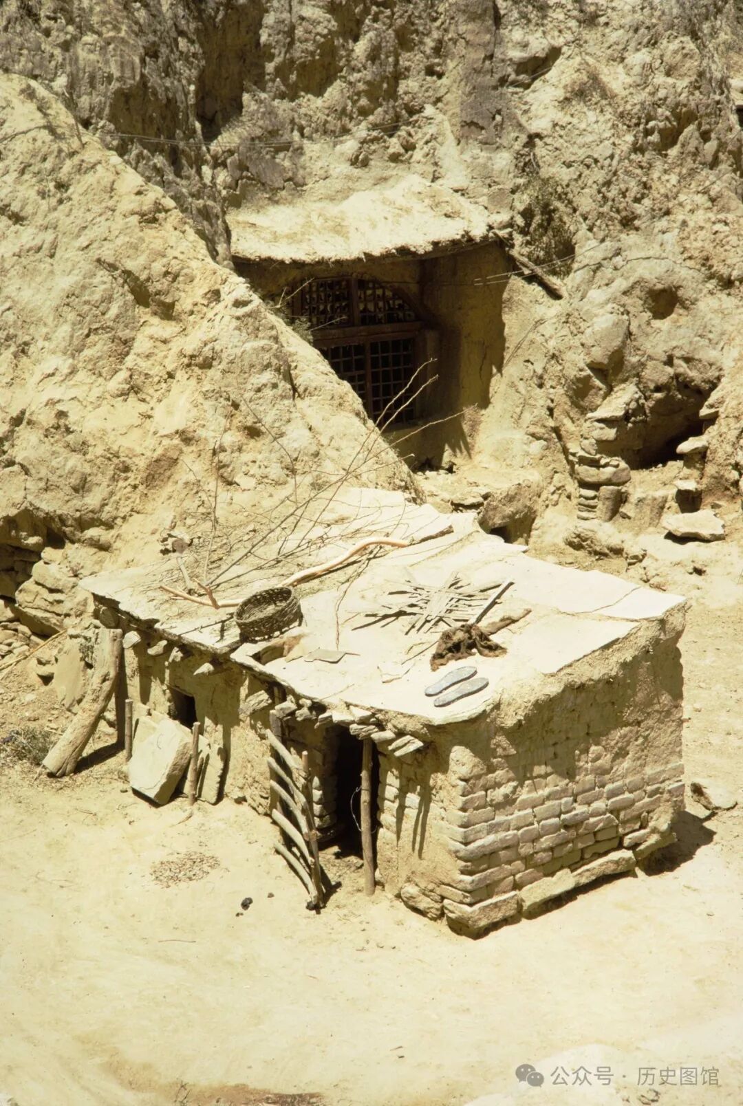 这也是居住在窑洞里的一户人家。窑洞门口垒砌有一个小的灶台,可能是烧土炕用的。窑洞里用土坯或砖头砌成的长方台,下面有孔道同烟囱相通。土炕可以用来睡觉,也可以坐在上面吃饭。
