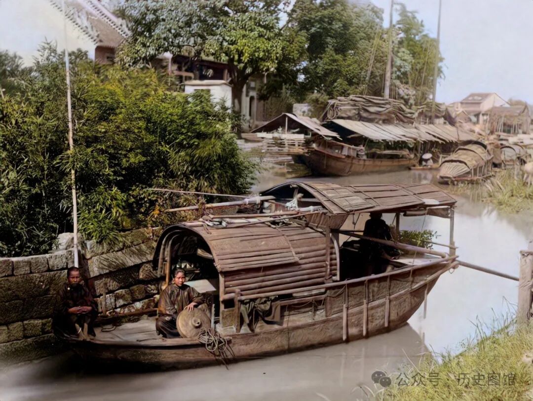 这是位于广州沙门岛和珠江北岸之间的一条狭窄水道,码头边停着不少船只。照片中这艘小舢板上,船工在船尾用力撑船,两名妇女在船头,好奇地看着摄影师。照片拍摄于1870年。