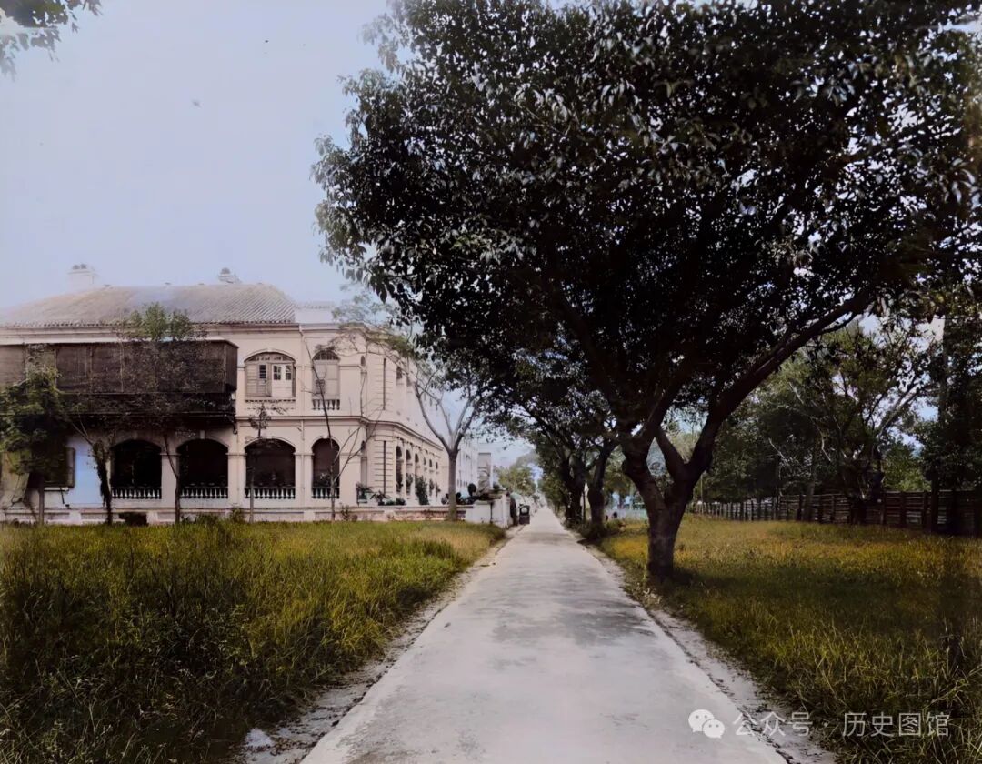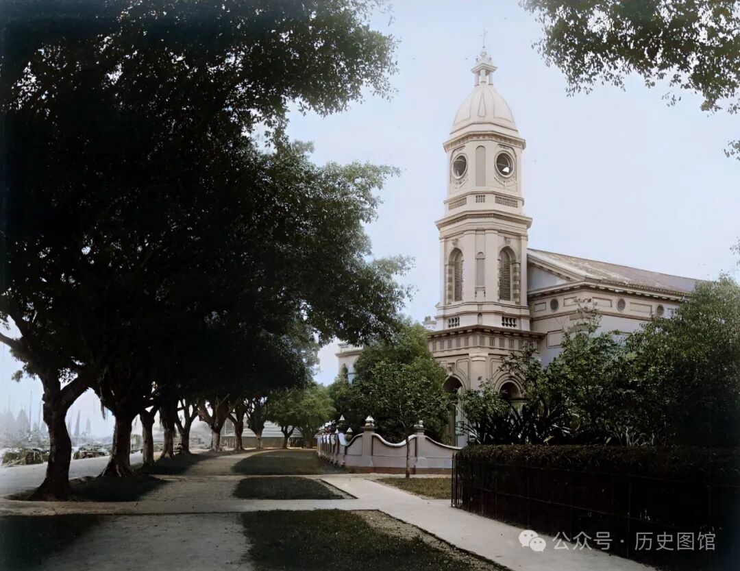 清朝末年,广州沙面岛风光。照片中,在岛边的码头上,停泊着不少船只。在林荫道的尽头矗立着一座欧式教堂,有高耸的尖顶塔楼,教堂四周建有围墙。