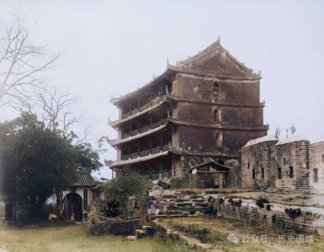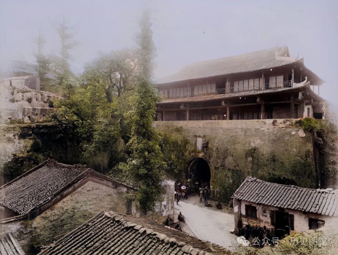 照片中,一条主干道两侧,分布着很多号舍。道路尽头矗立着一座高大的层阁式建筑——明远楼,楼上悬挂有“天开文运”匾额。该楼现为省级文物保护单位。