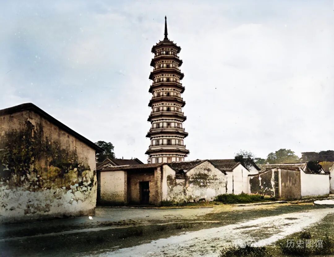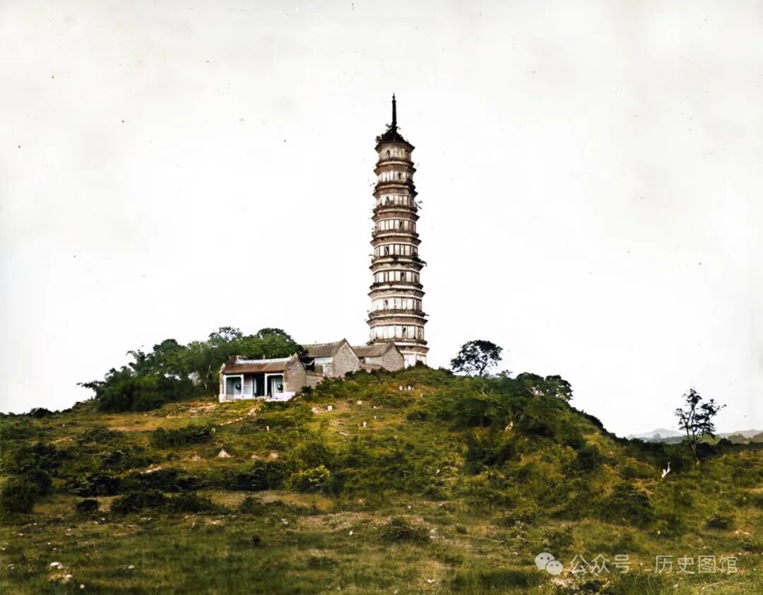 照片里的花塔,塔身高度有57米,17层。外形犹如一根花柱,因此取名叫花塔。照片拍摄于1870年。